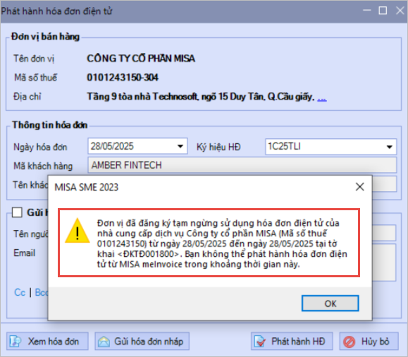 - Trường hợp cơ quan thuế thông báo ngừng sử dụng hóa đơn điện tử: Khi phát hành hóa đơn điện tử, nếu ngày phát hành thuộc khoảng thời gian ngừng sử dụng hóa đơn điện tử theo thông điệp của cơ quan thuế thì chương trình sẽ hiển thị cảnh báo người dùng không được phép phát hành hóa đơn: “Cơ quan thuế đã gửi thông báo số<…> cho đơn vị về việc ngừng sử dụng hóa đơn…“