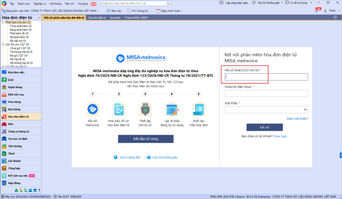 • Người dùng có thể kết nối với phần mềm MISA meInvoice thông qua mã số thuế hoặc căn cước công dân: