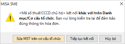• Trường hợp mã số thuế trên giao diện kết nối MISA meInvoice không trùng khớp với mã số thuế trên Danh mục/Cơ cấu tổ chức thì chương trình sẽ hiển thị cảnh báo: