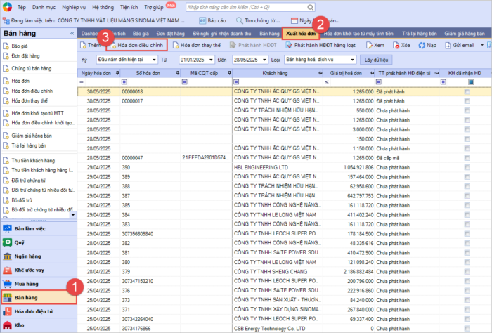 Bước 1: Trên phân hệ Bán hàng, tab Xuất hóa đơn, chọn chức năng Lập hóa đơn điều chỉnh: