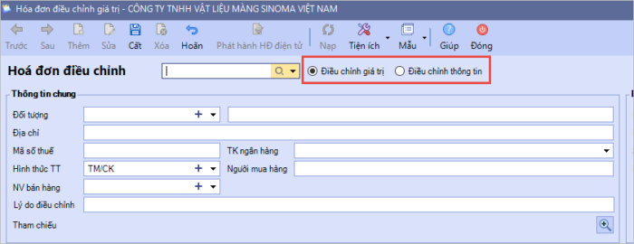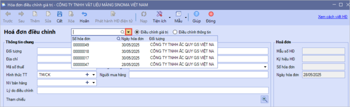 Bước 2: Chọn hóa đơn Điều chỉnh giá trị hoặc Điều chỉnh thông tin: