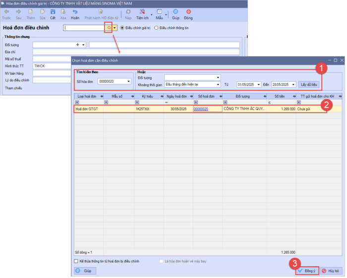 - Chọn hóa đơn muốn điều chỉnh và nhấn Đồng ý.