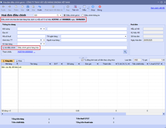 - Chương trình sẽ tự động lấy lên các thông tin chung của hóa đơn gốc, kế toán có thể sửa lại các thông tin này (nếu cần). Sau đó, nhập lý do điều chỉnh hóa đơn.