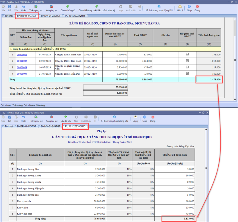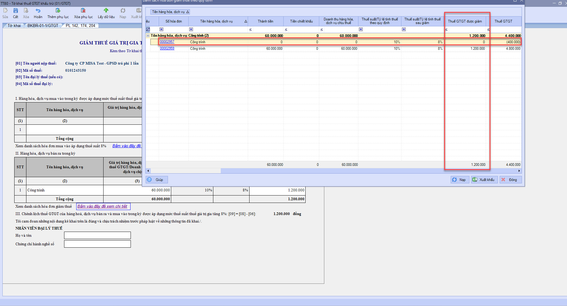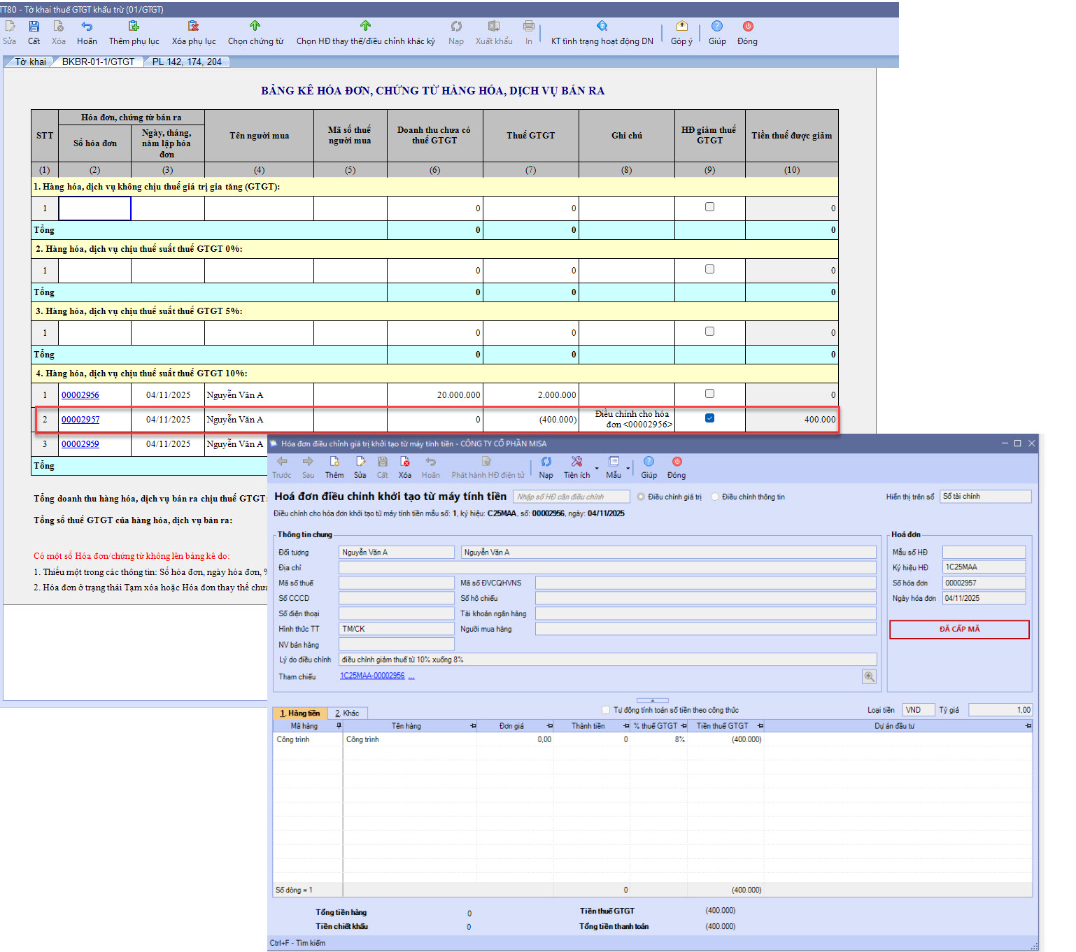 • Trên Phụ lục giảm thuế: Trong danh sách hóa đơn giảm thuế có hiển hóa điều chỉnh giảm và tiền thuế GTGT (số âm) nhưng không hiển thị tiền thuế GTGT được giảm => giao diện hàng hóa được giảm thuế không lấy được số liệu của các hóa đơn điều chỉnh này.
