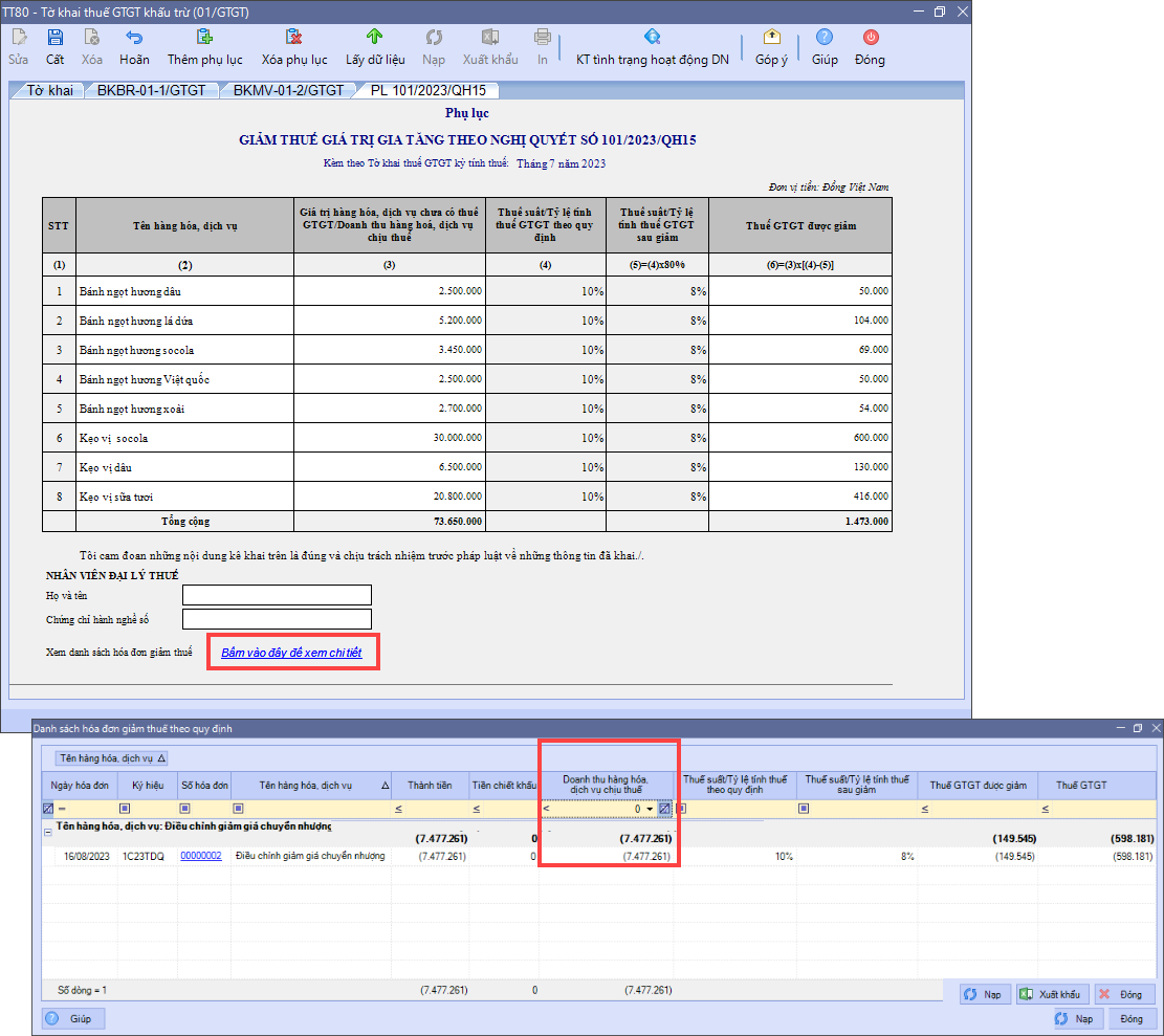 • Cách kiểm tra: Tại giao diện Phụ lục giảm thuế, Nhấn Bấm vào đây để xem chi tiết danh sách hoá đơn giảm thuế, sau đó lọc cột Doanh thu hàng hoá dịch vụ chịu thuế < 0