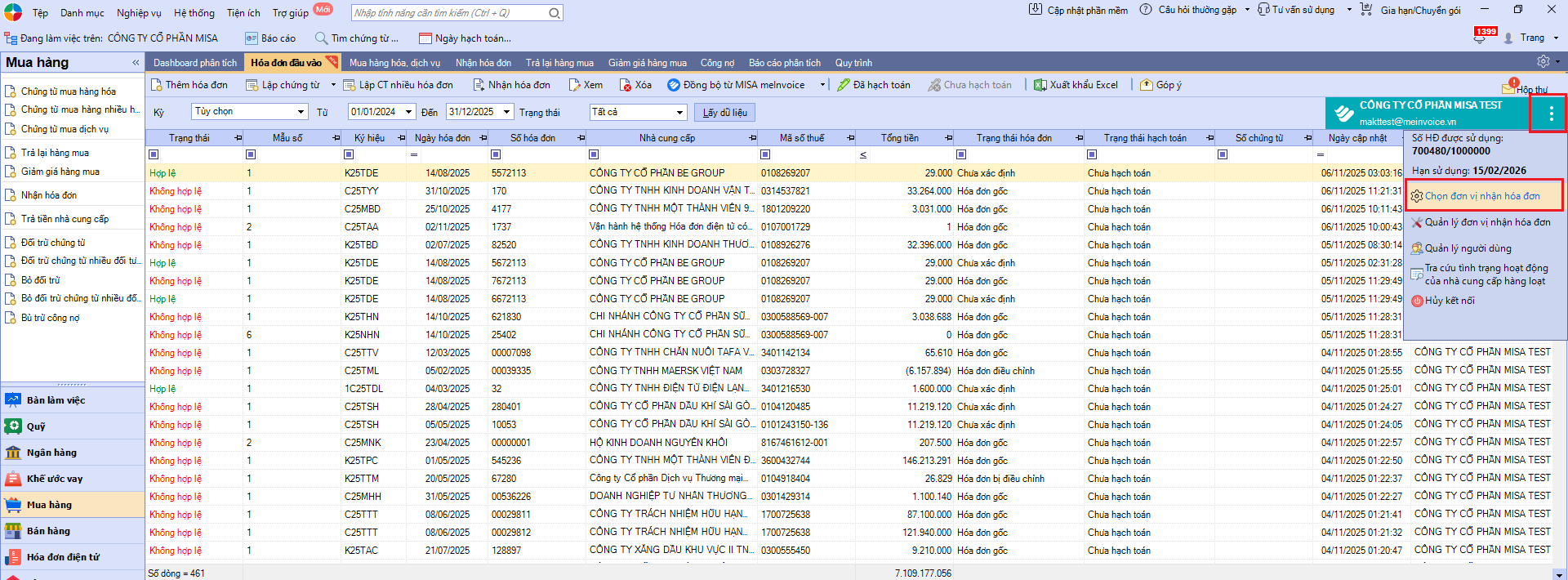 Nội dung: Phạm vi áp dụng: Dành cho các đơn vị có sử dụng phần mềm MISA meInvoice – Xử lý hóa đơn đầu vào để lấy hóa đơn từ trang thuế về phần mềm kế toán SME Bước 1: Nhấn vào link https://app3.meinvoice.vn/inbot và thực hiện đăng nhập để truy cập vào MISA meInvoice – Xử lý hóa đơn/ tại mục Kết nối cơ quan thuế, nhấn Kết nối ngay, kết nối hệ thống tra cứu hóa đơn của CQT bằng tài khoản đăng nhập trang hoadondientu.gdt.gov.vn Bước 2: Sau khi kết nối hệ thống CQT thành công, chương trình hiển thị nút Đồng bộ ngay Lưu ý: Trường hợp kết nối không thành công. Xem hướng dẫn tại đây. Bước 3: Để kết nối dịch vụ MISA meInvoice – Xử lý hóa đơn đầu vào trên MISA SME. Tại phân hệ Mua hàng, chọn Tab Hóa đơn đầu vào, nhấn Kết nối ngay và đăng nhập bằng tài khoản phần mềm xử lý hóa đơn đầu vào Bước 4: Nếu đơn vị có nhiều chi nhánh được tạo trên phần mềm Xử lý hóa đơn, anh chị nhấn biểu tượng 3 dấu chấm dọc, nhấn nút Chọn đơn vị nhận hóa đơn để chọn lại chi nhánh muốn đồng bộ hóa đơn đầu vào về PMKT Tham khảo hướng dẫn tại đây. Lưu ý: Có thể tham khảo chi tiết toàn bộ luồng dịch vụ xử lý hóa đơn đầu vào MISA meInvoice Tại đây Bước 5: Sau khi kết nối thành công, nhấn Đồng bộ từ MISA meInvoice về MISA SME và Lập các chứng từ mua hàng hoặc chứng từ liên quan từ hóa đơn đầu vào đã lấy về Nếu cần xuất excel danh sách hóa đơn đầu vào đã được đồng bộ về SME thì nhấn vào mục Xuất khẩu excel trên thanh công cụ để xuất ra danh sách hóa đơn.