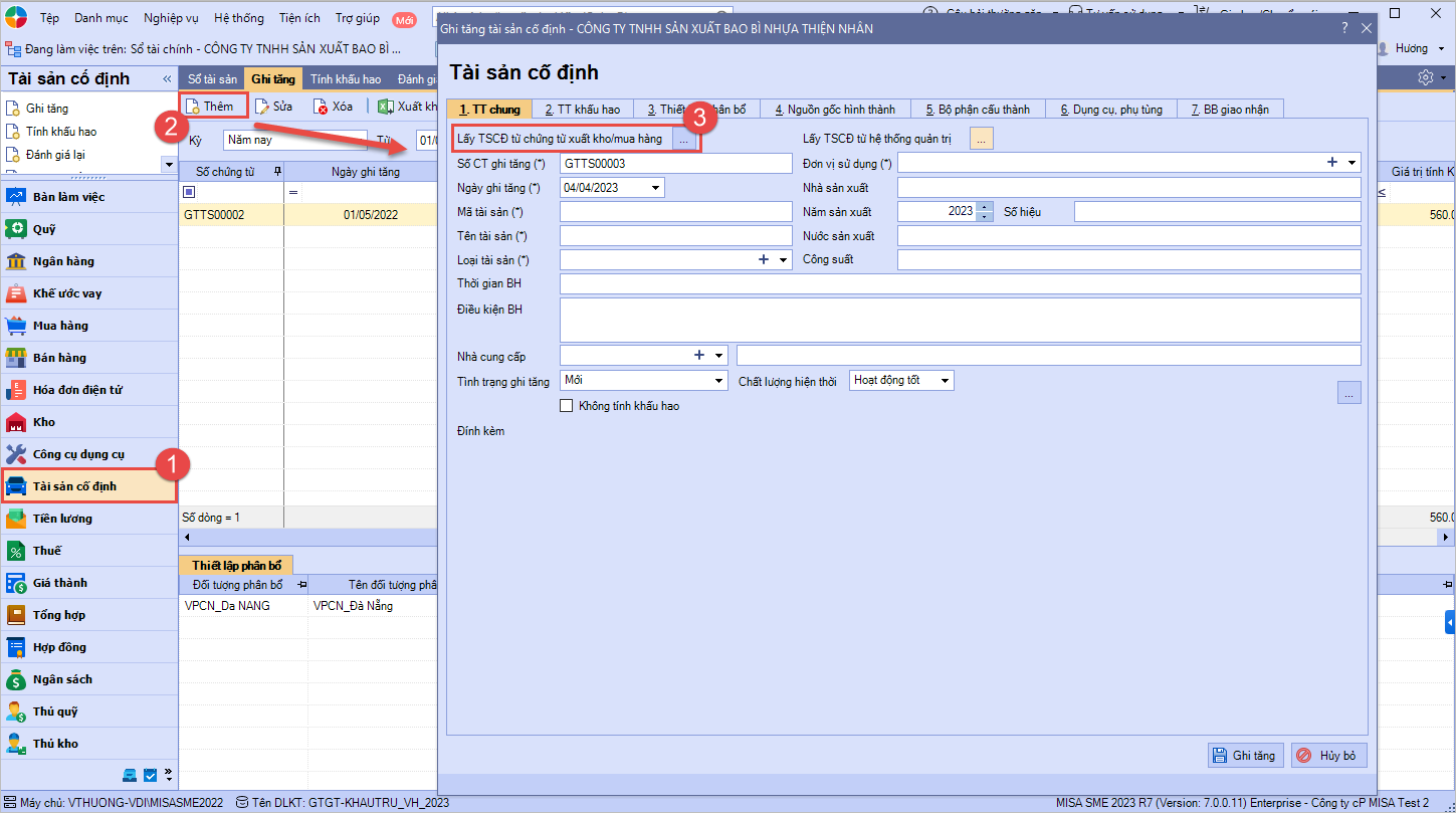 - Bước 1: Vào phân hệ Tài sản cố định, chọn Ghi tăng (hoặc vào tab Ghi tăng, nhấn Thêm).