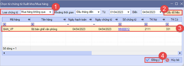 - Bước 4: Nhấn Lấy dữ liệu. Chương trình sẽ lấy lên các chứng từ xuất kho/mua hàng VTHH/Thành phẩm, hạch toán TK Nợ (hoặc Nợ TK chi phí) là 211x, 212x, 213x, 217x; chưa từng được chọn để lập chứng từ ghi tăng TSCĐ hoặc làm nguồn gốc hình thành của TSCĐ nào khác trước đó.