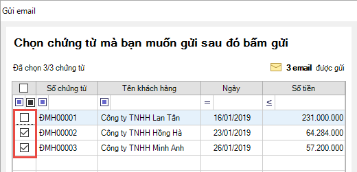 - Sau khi chọn hàng loạt, nếu muốn bỏ bớt chứng từ khỏi email, chỉ cần bỏ tích chọn chứng từ đó – không cần chọn lại từ đầu.