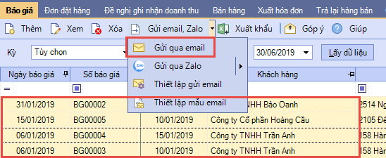 - Có thể gửi hàng loạt chứng từ cùng loại bằng cách: Mở danh sách chứng từ ( Đơn đặt hàng, Báo giá, Đơn mua hàng, ..) , giữ phím Ctrl và chọn nhiều chứng từ, sau đó nhấn Gửi email.