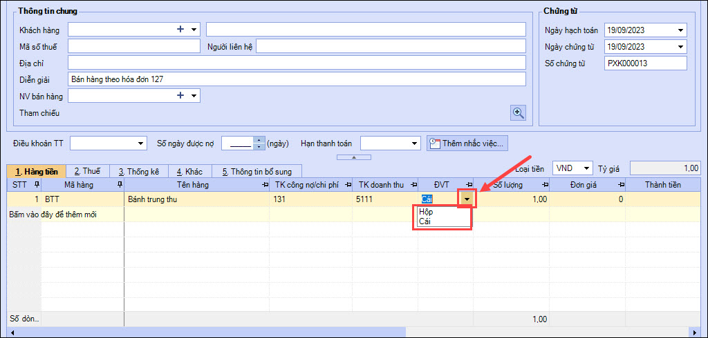 Bước 3: Sau đó thêm mới lại chứng từ, chọn mã hàng, phần mềm tự động lấy lên đơn vị tính chính, bạn nhấp chuột vào ô đơn vị tính (ĐVT), nhấn vào biểu tượng mũi tên xổ xuống để chọn lại đơn vị chuyển đổi.
