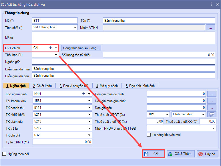 Bước 4: Tại mục Đơn vị tính chính (ĐVT chính), bạn chọn đơn vị tính của mã hàng.
