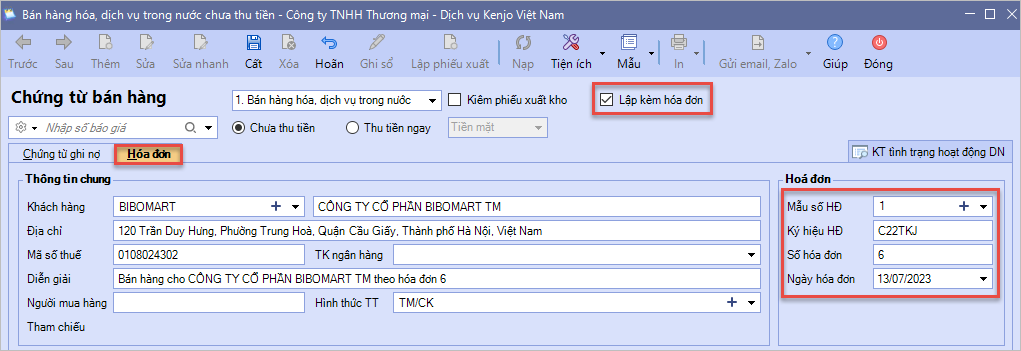 Bước 3: Tại giao diện lập chứng từ, tích chọn Lập kèm hóa đơn và chủ động nhập tay thông tin hóa đơn đã phát hành trên phần mềm khác để phục vụ cho công tác kê khai thuế.