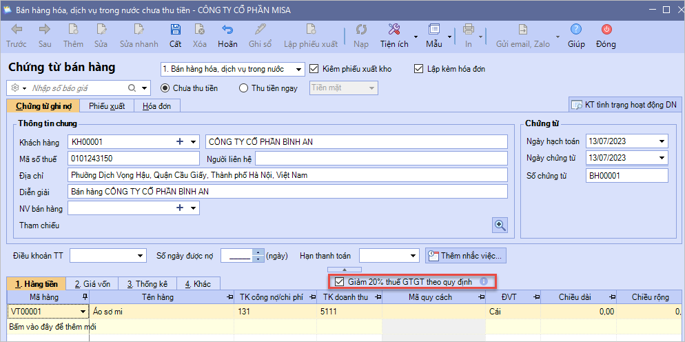 - Trên chứng từ bán hàng, tích chọn tickbox Giảm 20% thuế GTGT theo quy định