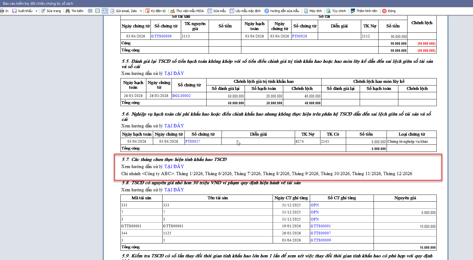 Bước 2: Kiểm tra mục 5.7. Các tháng chưa thực hiện tính khấu hao TSCĐ phần mềm sẽ chỉ ra các tháng chưa thực hiện tính khấu hao TSCĐ.