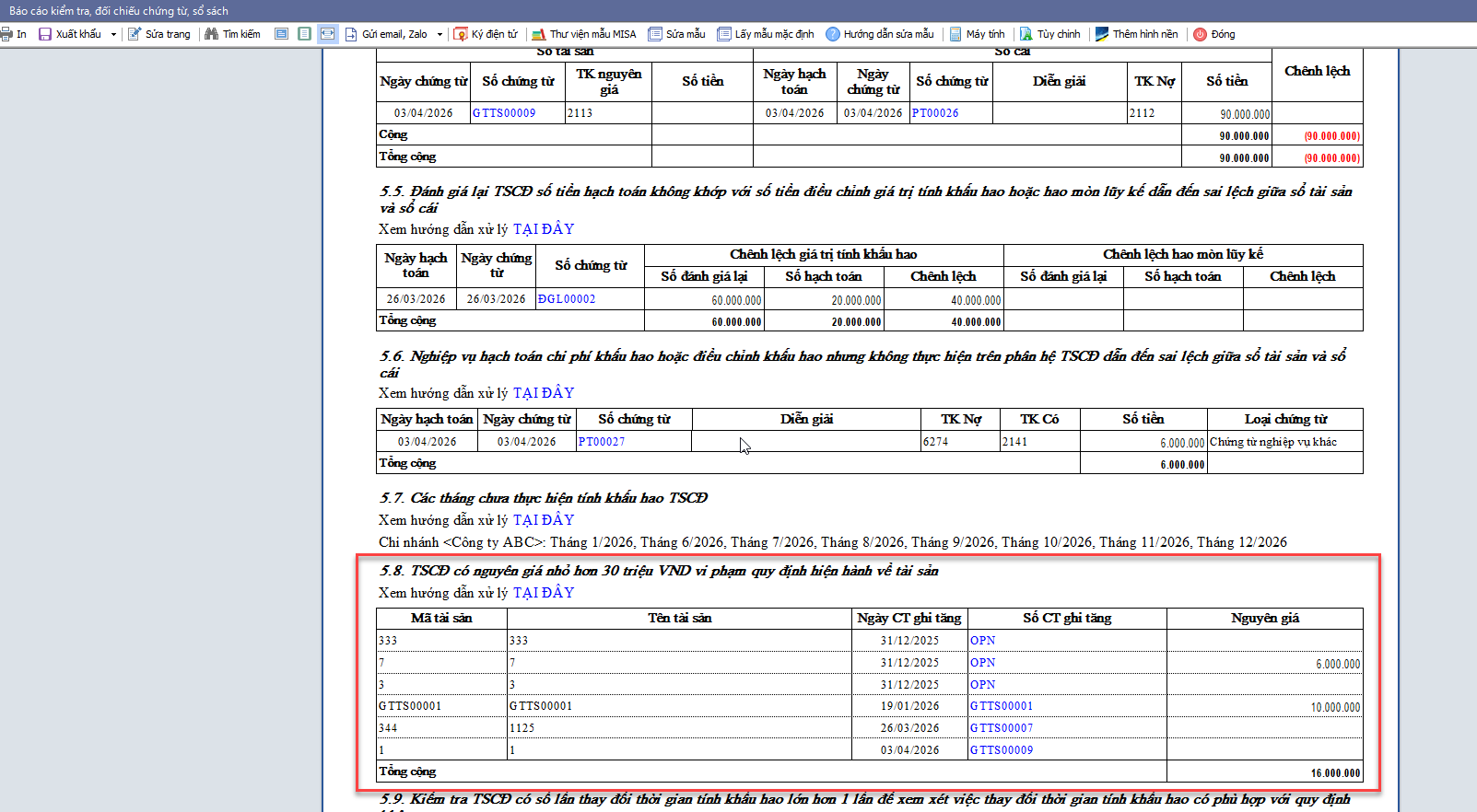 Bước 2: Kiểm tra mục 5.8. TSCĐ có nguyên giá nhỏ hơn 30 triệu VND vi phạm quy định hiện hành về tài sản.