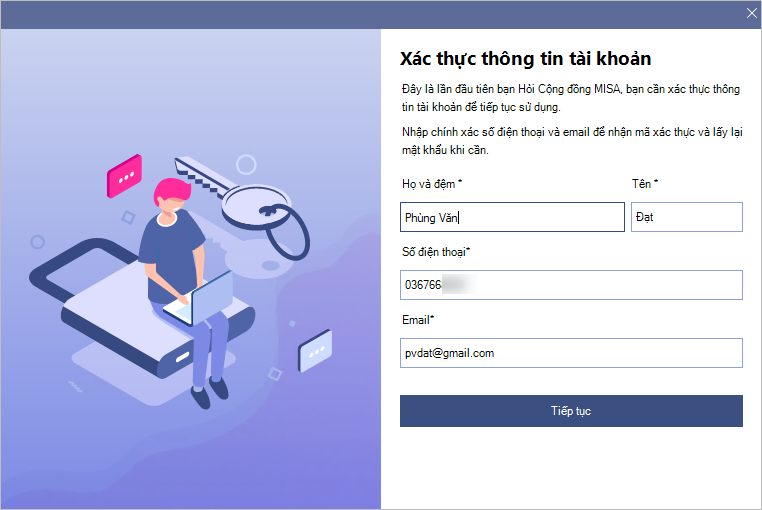 - Với user đăng nhập lần đầu tiên sử dụng chức năng hỏi cộng đồng MISA, cần xác thực thông tin tài khoản để tiếp tục sử dụng.