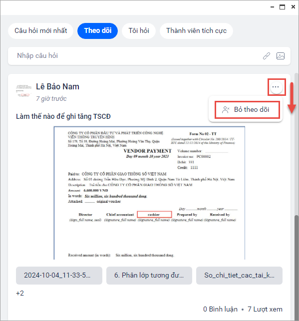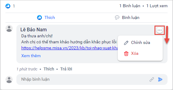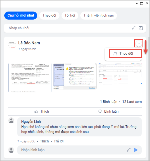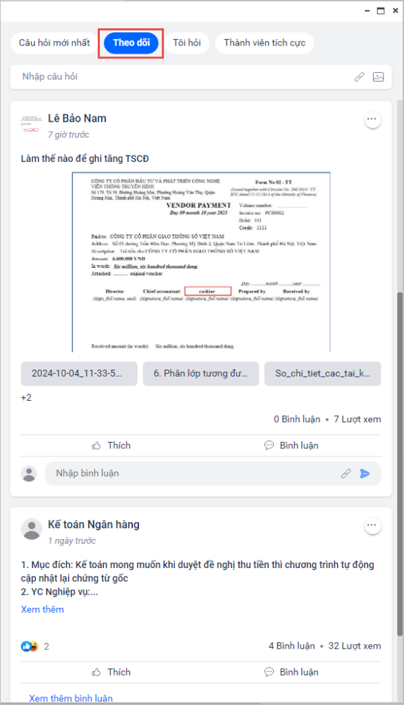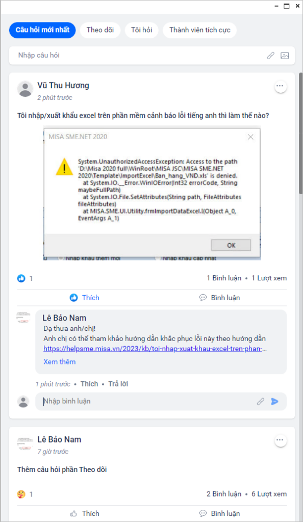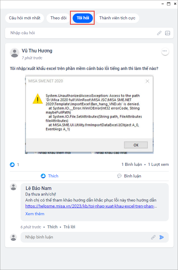 Sau khi xác thực, phần mềm tự động điều hướng sang cửa sổ hỏi cộng đồng MISA trực tuyến. Tại đây liệt kê tất cả các câu hỏi của anh chị hoặc của người khác trong cộng đồng. Anh chị có thể tương tác với bài viết bằng cách thả Like, thả Tim, Bình luận, … hoặc Theo dõi bài viết: