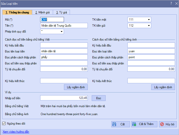 - Với các loại tiền không có sẵn trong danh mục thì nhấn Thêm và khai báo các thông tin tương tự như sửa loại tiền ở trên.