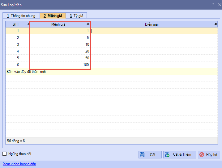 Bước 3: Khai báo mệnh giá của loại tiền để phục vụ Kiểm kê quỹ tại tab Mệnh giá: