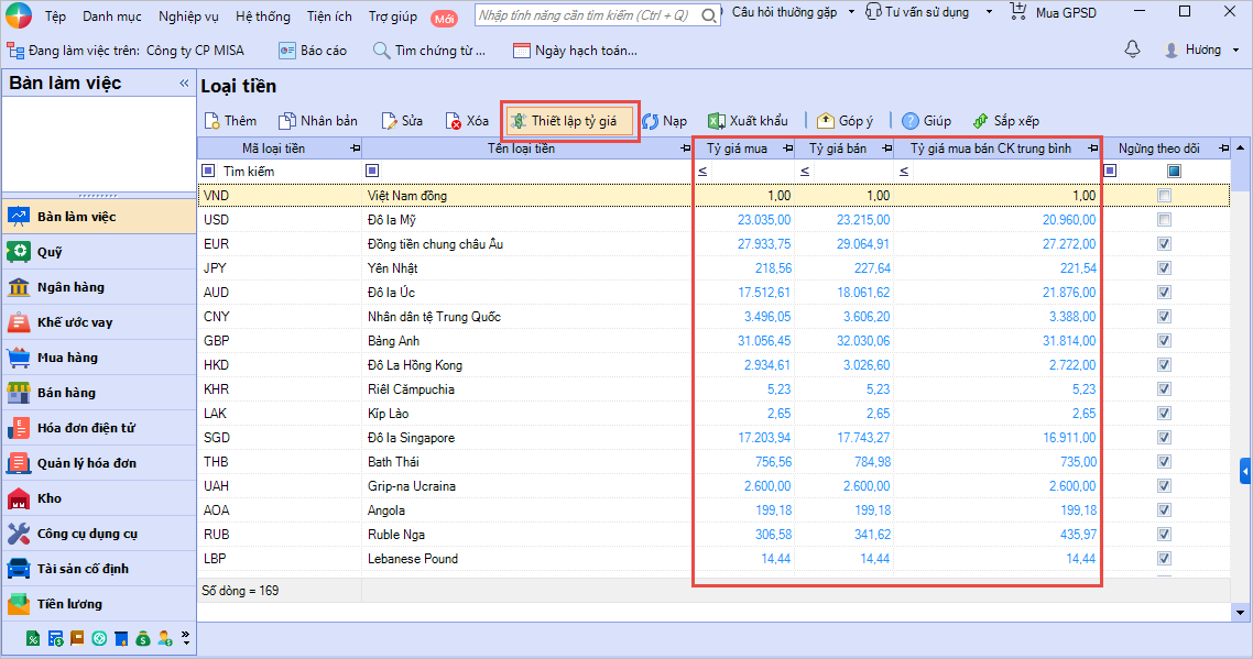 Lưu ý: Có thể thiết lập nhanh tỷ giá bằng cách nhấn Thiết lập tỷ giá hoặc nhấn vào cột Tỷ giá trên danh mục Loại tiền