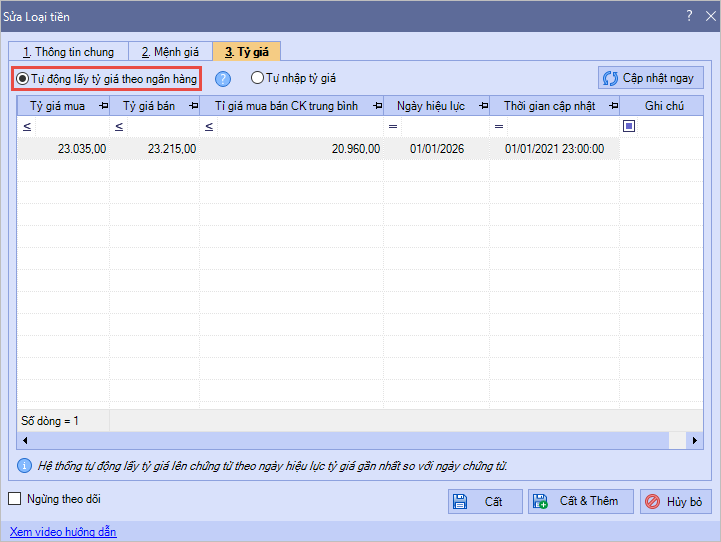 Cách 1: Tự động lấy tỷ giá theo ngân hàng (Áp dụng với đơn vị sử dụng tỷ giá của ngân hàng Vietcombank)