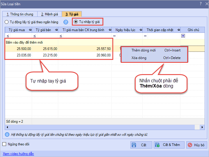 - Kế toán phải tự nhập tay tỷ giá mua, tỷ giá bán lên danh mục loại tiền, có thể nhấn chuột phải Thêm dòng để nhập tỷ giá theo ngày.