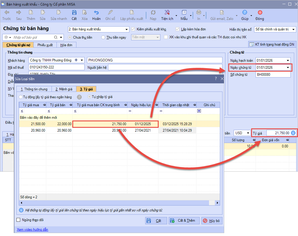 => Khi lập chứng từ hạch toán ngoại tệ, chương trình sẽ tự động lấy tỷ giá gần nhất trên danh mục Loại tiền lên chứng từ