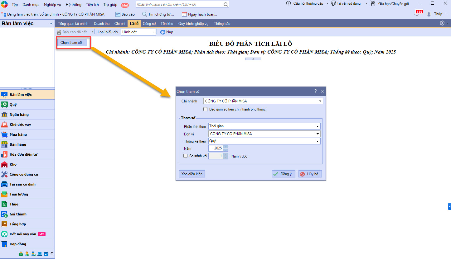 Bước 3: Nhấn Đồng ý để xem kết quả phân tích lãi lỗ theo các tiêu chí đã chọn.
