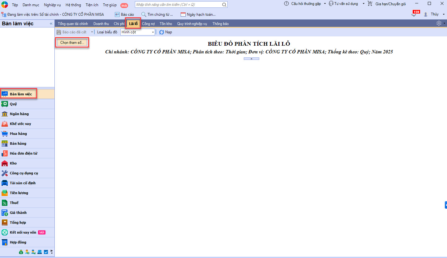 Bước 1: Vào phân hệ Bàn làm việc chọn bảng Lãi lỗ, nhấn Chọn tham số