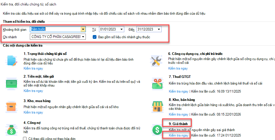 Bước 3: Tại mục 9. Giá thành nhấn Kiểm tra ngay, phần mềm cảnh báo nguyên nhân nào thì anh/chị chọn trong các nguyên nhân sau để được hướng dẫn
