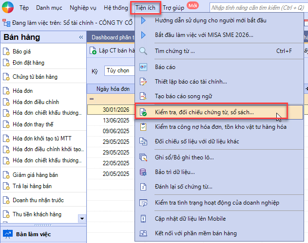 Bước 1: Vào menu Tiện ích\Kiểm tra, đối chiếu chứng từ, sổ sách.