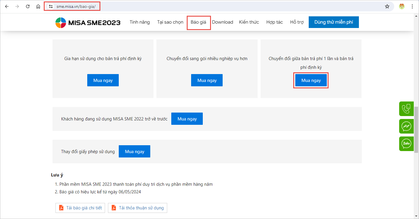 • Truy cập vào website https://sme.misa.vn. Vào Báo giá  – Chọn mục Chuyển đổi giữa bản trả phí 1 lần và bản trả phí định kỳ –  Nhấn Mua ngay