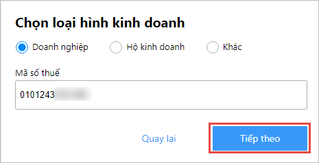 • Nhập Mã số thuế – Nhấn Tiếp theo