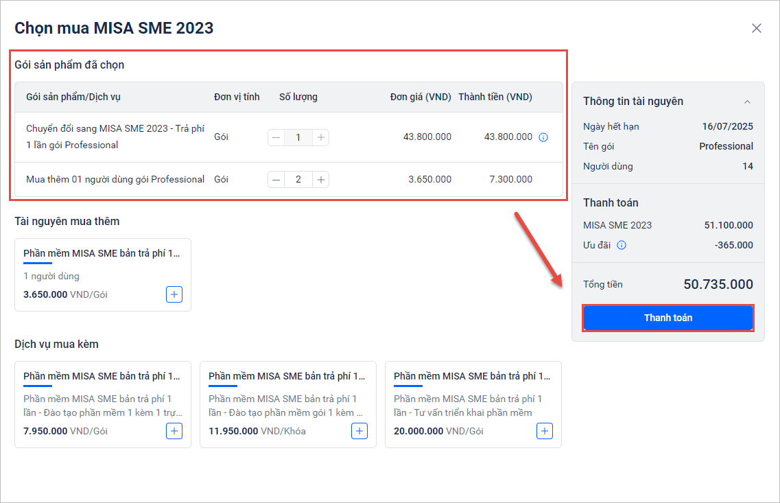 • Bước 3: Kiểm tra lại thông tin tài nguyên và nhấn mua thêm người dùng ( Nếu có nhu cầu) – Nhấn Thanh toán