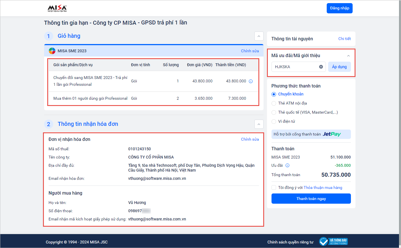 • Bước 4: Nhập mã khuyến mại/giảm giá (nếu có), nhấn Áp dụng.