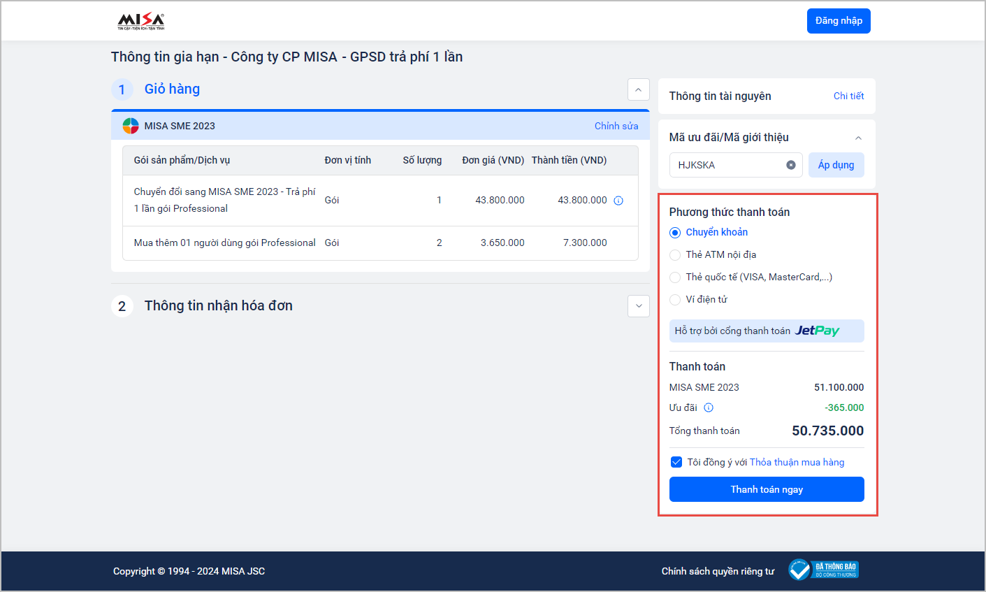 • Bước 7: Nhấn tiếp tục và lựa chọn 1 trong 4 cách thức thanh toán. Tích chọn Tôi đồng ý với Thỏa thuận mua hàng. Nhấn Thanh toán ngay.