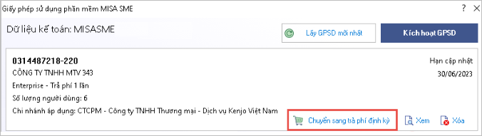 • Cách 2:  Chuyển sang trả phí định kỳ từ giao diện phần mềm: Vào Trợ giúp\Đăng ký giấy phép sử dụng, nhấn Xem. Sau đó nhấn Chuyển sang trả phí định kỳ