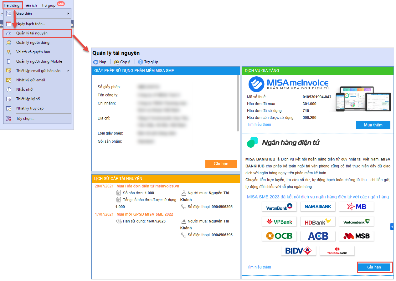 Hoặc vào menu Hệ thống\Quản lý tài nguyên, nhấn Gia hạn