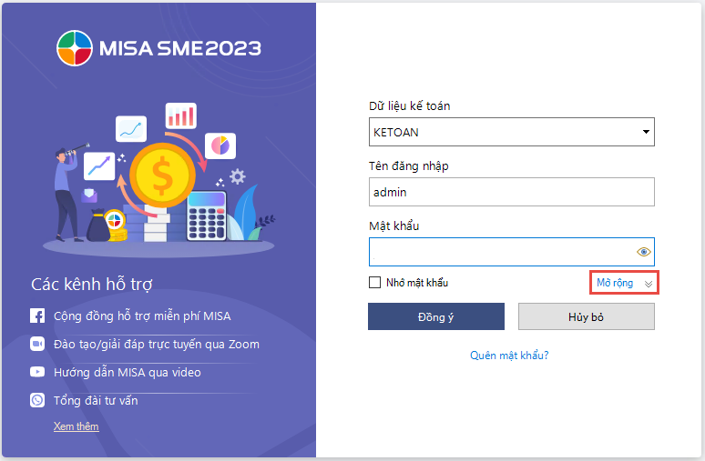 Bước 4: Xuất hiện màn hình đăng nhập, nhấn Mở rộng.