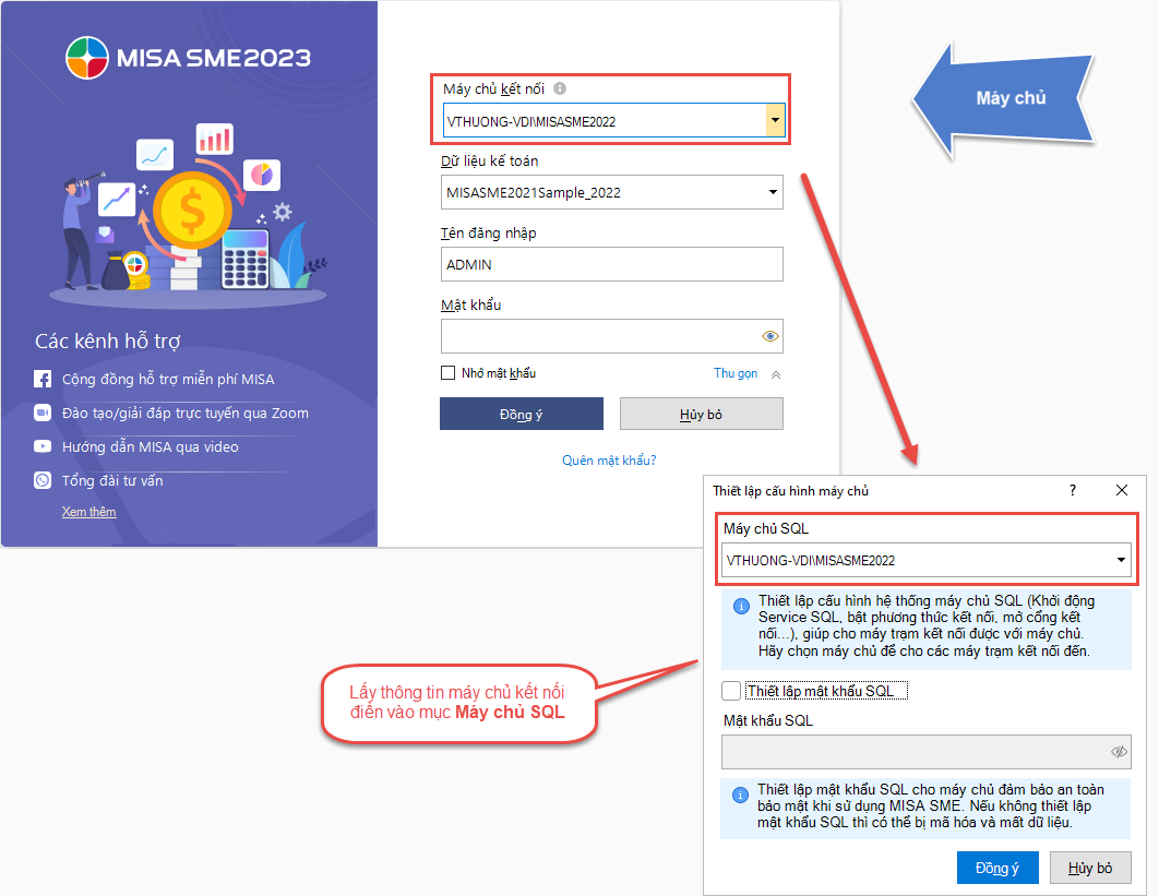 Bước 5: Lấy thông tin Máy chủ kết nối trên phần mềm điền vào mục Máy chủ SQL trên màn hình Thiết lập cấu hình máy chủ.