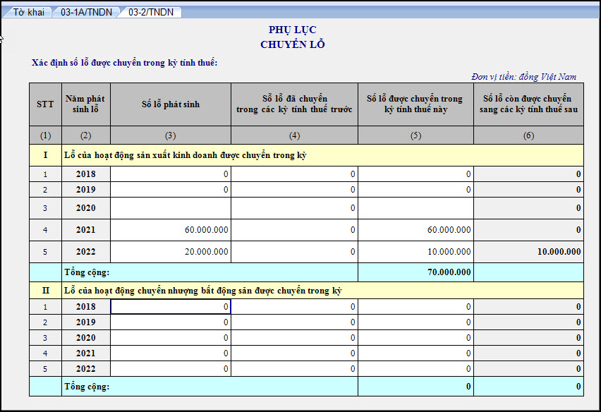 Thực hiện lập tờ khai Quyết toán thuế TNDN 03/TNDN và phụ lục 03-2A/TNDN như sau: Cách chuyển lỗ trên phụ lục 03-2A/TNDN: