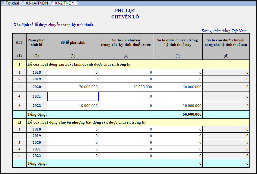 2.4. Hướng dẫn kê khai phụ lục chuyển lỗ 03-2A/TNDNChuyển lỗ đối với các doanh nghiệp có phát sinh lỗ các năm trước và lãi ở kỳ sau đó là công việc phải thực hiện khi lập tờ khai quyết toán thuế TNDN. Phụ lục chuyển lỗ trên phần mềm không tự động lấy lên số liệu, người dùng cần tự nhập tay số liệu Cách thực hiện: Lập tờ khai TT80-Quyết toán thuế TNDN năm (03/TNDN), tích chọn Phụ lục 03-2\TNDN Chuyển lỗ Dưới đây là các ví dụ cho những trường hợp đặc trưng cho chuyển lỗ và kê khai trên phụ lục 03-2A/TNDN: Ví dụ 4: Công ty D có số liệu như sau: