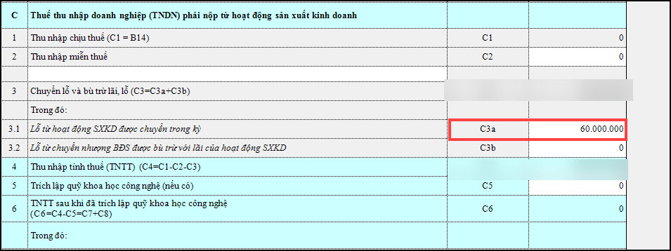 Doanh nghiệp phát sinh lãi chỉ tiêu C4 (tờ khai quyết toán thuế TNDN)– thu nhập tính thuế có phát sinh dương (lãi) mà các năm trước còn số lỗ chưa kết chuyển hết kế toán thực hiện việc chuyển lỗ trên phụ lục 03-2A/TNDN. Sau khi thực hiện chuyển lỗ trên phụ lục 03-2A/TNDN, phần mềm sẽ tự động cập nhập trên Mã chỉ tiêu C3a trên tờ khai quyết toán 03/TNDN.