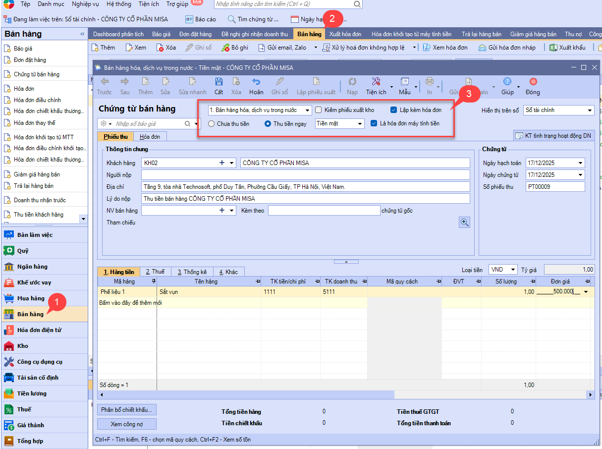 Lưu ý: Nếu chứng từ bán hàng lựa chọn phương thức Thu tiền ngay, chương trình sẽ căn cứ vào hình thức thanh toán là tiền mặt hay chuyển khoản mà tự động sinh ra các chứng từ thu tiền mặt hoặc thu tiền gửi ngân hàng trên phân hệ Quỹ hoặc Ngân hàng.