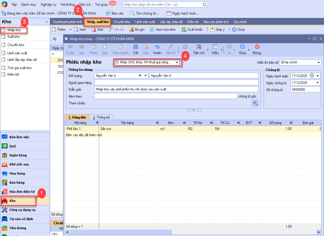 Bước 2: Chọn loại phiếu nhập kho là Khác (NVL thừa, HH thuê gia công)