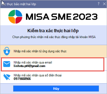 • Chương trình hiển thị thông báo kiểm tra xác thực 2 lớp, mã xác nhận sẽ được gửi đến địa chỉ email của người dùng: