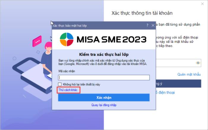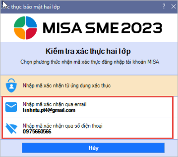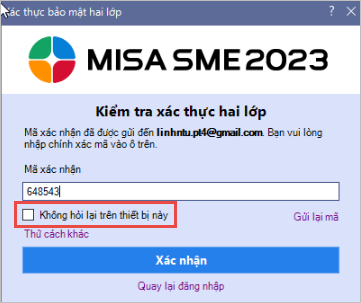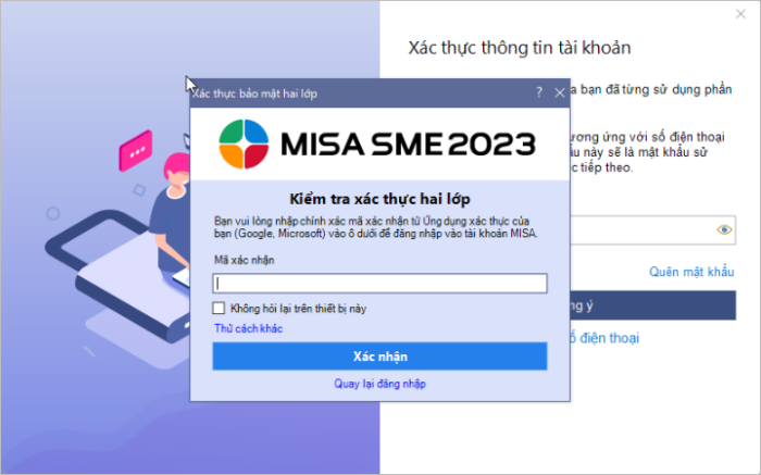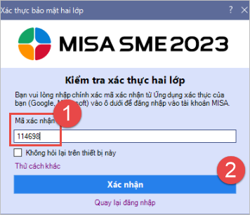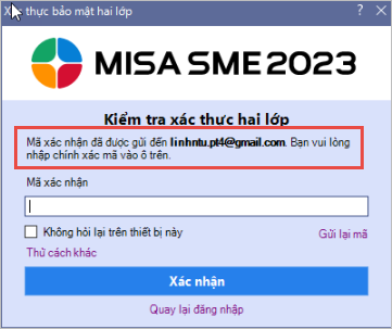 • Sau khi bật xác thực 2 yếu tố thành công trên MISA ID, khi người dùng thực hiện đăng nhập vào phần mềm chương trình sẽ hiển thị thông báo kiểm tra xác thực 2 lớp: