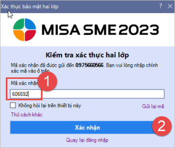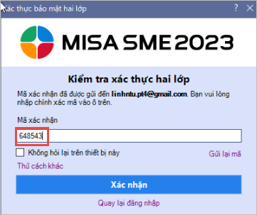 • Nhập chính xác mã xác nhận vừa nhận được vào giao diện kiểm tra xác thực hai lớp, nhấn Xác nhận để đăng nhập vào phần mềm: