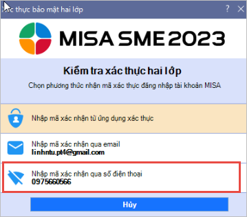 • Chương trình hiển thị giao diện chọn phương thức nhận mã xác thực đăng nhập tài khoản MISA. Ngoài phương thức nhập mã xác nhận từ ứng dụng xác thực, người dùng còn có thể lựa chọn nhập mã xác nhận qua email hoặc số điện thoại: